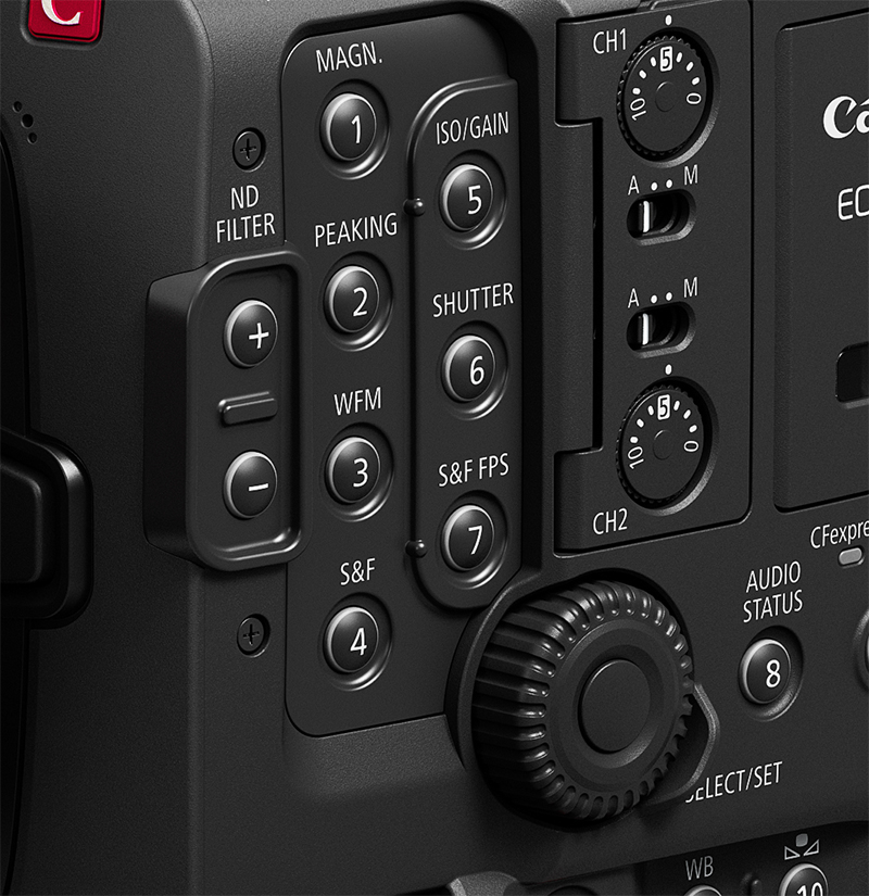 Audio controls are now on the operator side, unlike the EOS C300 Mark III and C500 Mark II.