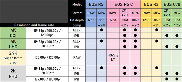 *High Frame Rate 120p recording in 4K DCI is supported only on the EOS R5 C. **High Frame Rate 120p recording in 4K UHD and 2K FHD are supported only on the EOS R5 C and EOS C70.