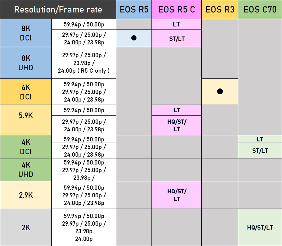The EOS R5 and EOS R5 C can shoot video up to 8K DCI, the EOS R3 up to 6K, and the EOS C70 up to 4K DCI.