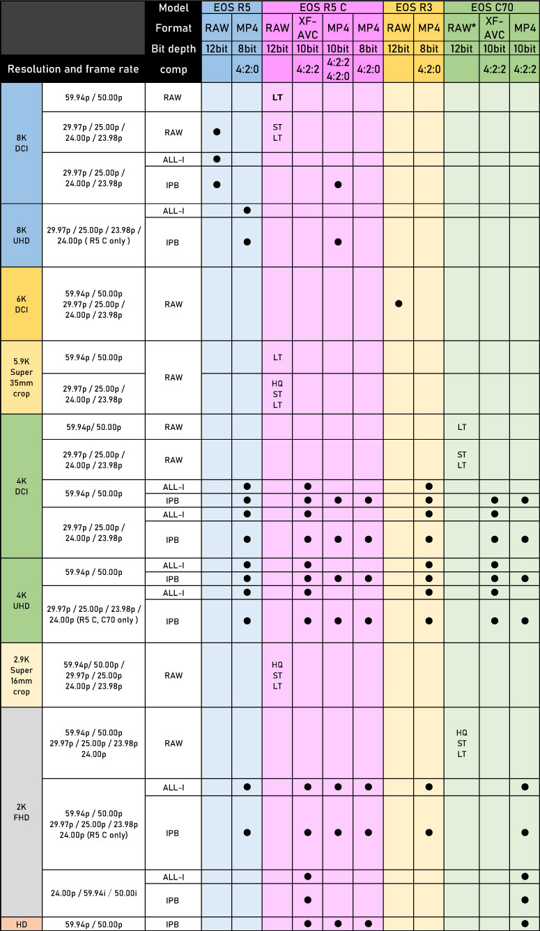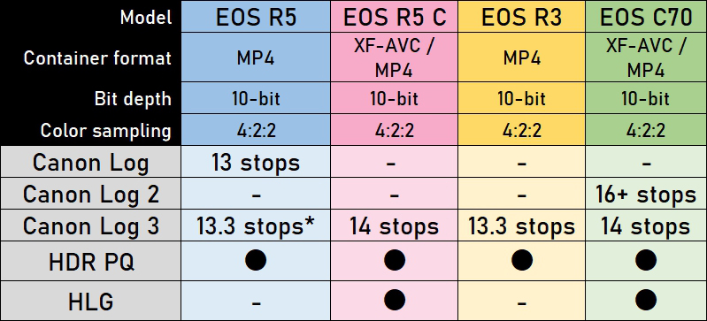 Key video specifications for EOS R5, EOS R5 C, EOS R3, and EOS C70
