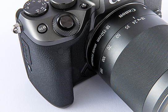 With a deep grip, the body comes in a size that is easy to hold. Though my hands are relatively large, I could feel how well the EOS M5 fits into them the moment I held it. The thumb grip at the back is also well located, so the camera can be held stably with just one hand.