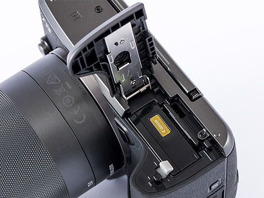 The EOS M5 uses SD cards as the recording media, including the UHS-I Class. The battery compartment for the Battery Pack LP-E17 and the card slot are integrally designed.