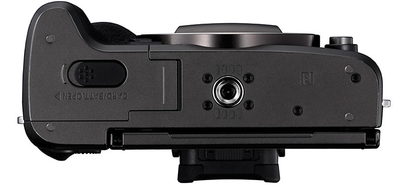 The Mode Dial and the power switch are located on the left at the top of the body. This is a similar arrangement to that of the EOS DSLR models. The built-in flash is situated at the centre and integrated with the EVF.