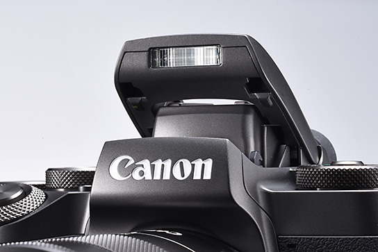 The built-in pop-up flash. On the EOS M3, this was located to the side of the camera, but on the EOS M5, it is to the centre of the body.