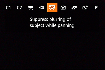 The Panning function automatically selects the optimal shutter speed by analysing the panning speed of the camera and the speed of the subject. It is added to the SCN modes, and the effect can be adjusted to one of the three levels: Max., Med. or Min. Subject blur can be reduced when you are using an IS lens that supports this function.