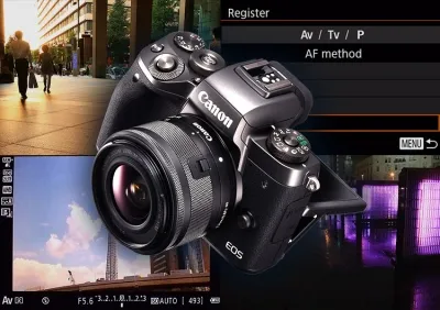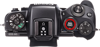The most significant change in the controls of the EOS M5 is the use of the DIAL FUNC. button for setting the functions. Pressing the DIAL FUNC. button displays a rolling selection of the parameter at the bottom of the screen. The settable parameter is indicated in an orange frame. You can set the ISO speed and white balance in the default setting.