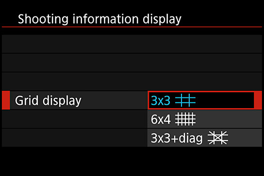 3. On Shooting Menu 1, select “Shooting information display” → “Grid display” → “3x3”.