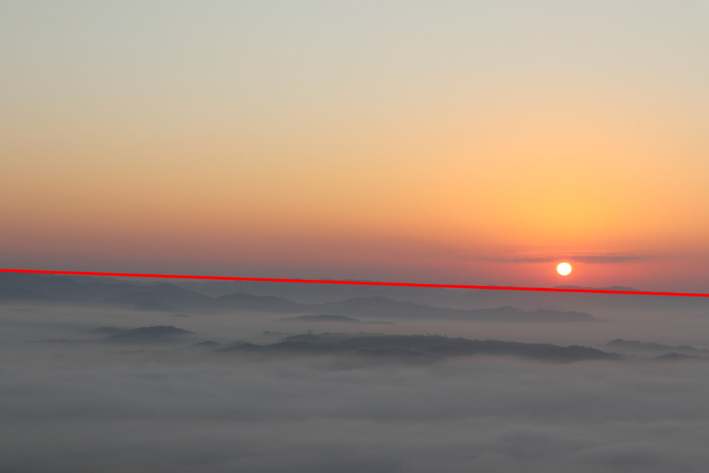When shooting a sea of clouds as in the photo below, or placing the land and sea horizon lines in the frame for your shoot, it is important how you express its magnificence. If you shoot the land and sea horizons on a slant, the sense of tension disappears, and the picture looks less magnificent as a result. To avoid this, display the electronic level and use it to make sure that the camera is level with the horizon while shooting. That way, you can clearly depict the horizon.