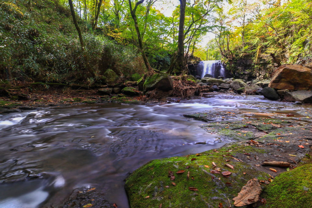 A river surrounded by green trees. Although it is a beautiful scene, it is somewhat dark as it is covered by the trees. Because I also wanted to capture the flow of the water, I used a shutter speed of 10 seconds, and set the Picture Style to “Landscape” to add colour.