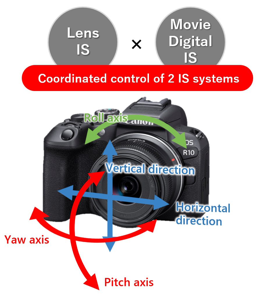 Although the EOS R10 is not equipped with an In-Body Image Stabilizer (In-Body IS), it has in-camera gyro sensors that detect camera shake, and the Movie Digital IS function which performs 5-axis digital camera shake correction during video shooting. When a lens equipped with the Optical Image Stabilizer (Optical IS) is attached, the Optical IS and Movie Digital IS work together to perform Coordinated Control IS for more effective image stabilisation. This translates to stable, seamless video even when you are shooting handheld while walking.