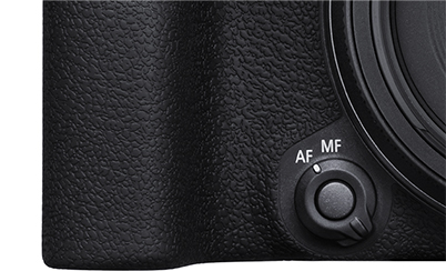 A focus mode switch is located on the front of the body. This allows for easy switching between AF and MF modes even when using lenses without such a switch. The button in the centre is the depth-of-field preview button.