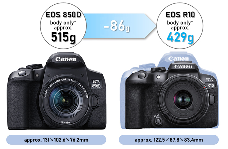 Designed as an entry-intermediate model, the EOS R10 is similar in positioning to the EOS 850D. However, it shares some powerful specifications more often associated with higher-end cameras like the EOS 7D Mark II, such as its fast continuous shooting speed. It also leverages the benefits of the mirrorless camera system, manifesting in a body that is smaller and lighter than the EOS 850D.
