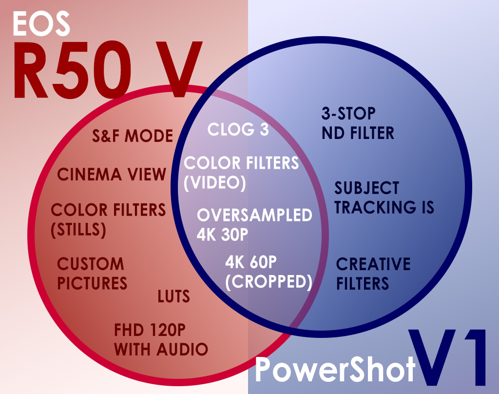 The EOS R50 V has more vertical video and livestreaming features than the PowerShot V1: