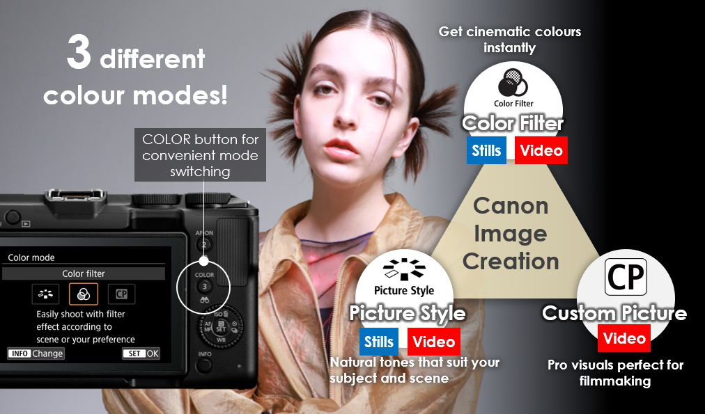 i) Picture Style: the conventional colour profiles present on all EOS cameras; ii) Custom Picture (CP): The colour profiles on the Cinema EOS system; and iii) Color Filter: a new function that offers 14 colour presets.