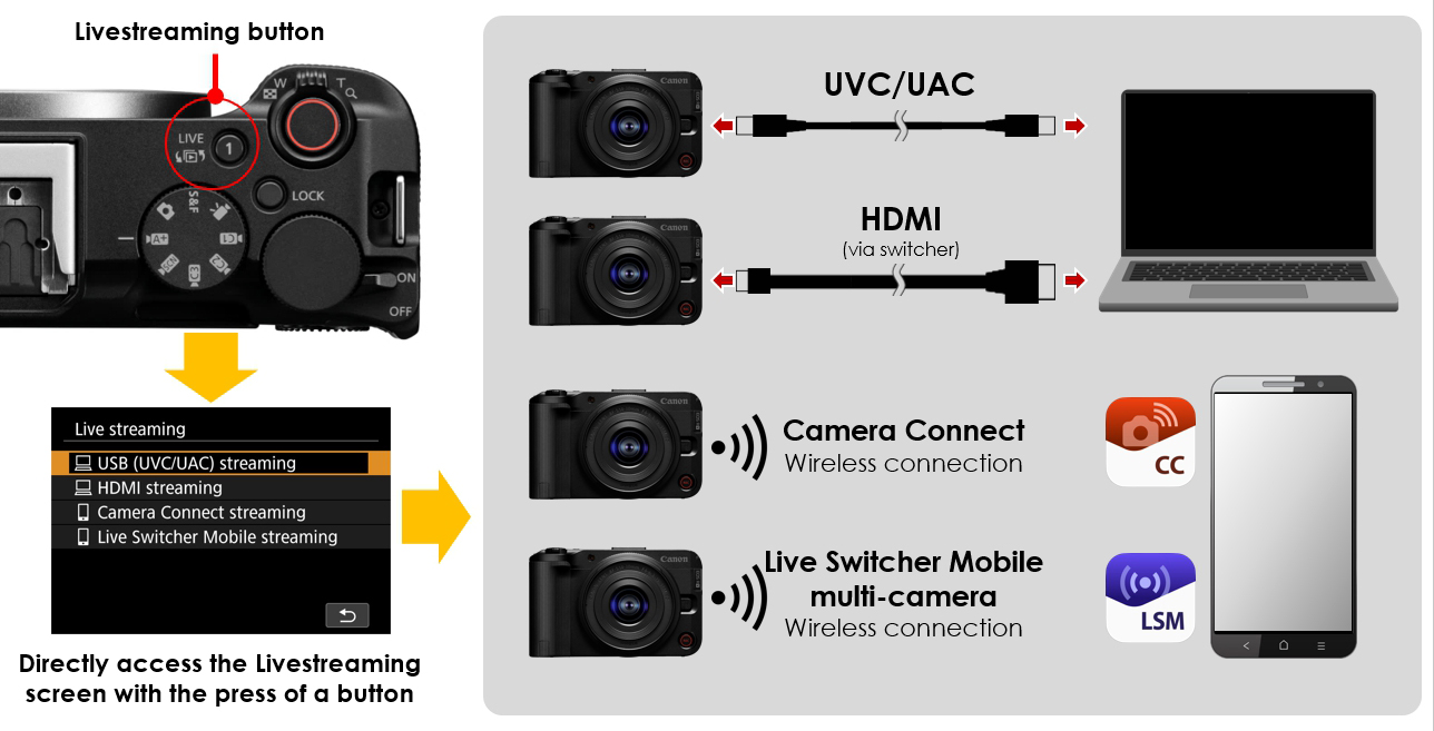 The EOS R50 V has a Livestreaming shortcut button that calls up the “Live streaming” menu. There are four ways connect the camera to your livestreaming platform:
