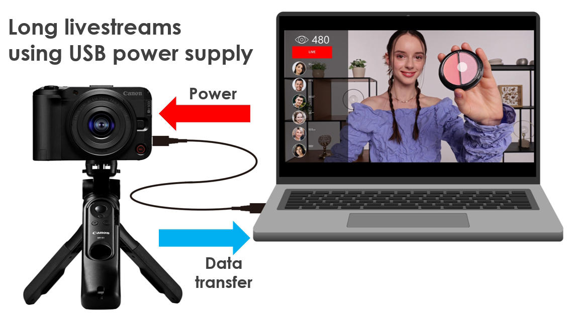 As the EOS R50 V supports UVC/UAC, just a single USB-C cable connection to a PC is needed for video conferencing and livestreaming. When streaming in Full HD, the camera draws power from the PC*, so you can livestream for long durations without worrying about running out of batteries. When livestreaming using Smooth Skin** mode or in the high-quality cropped 4K 60 fps mode, you can also make use of the Movie for Close-up Demos AF mode, which automatically switches focus from your face to a product placed in front of the camera.