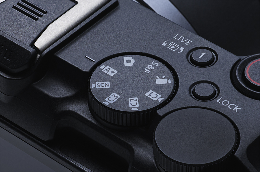 The mode dial switches between various video modes—you use the rear LCD touchscreen panel to navigate still shooting modes.