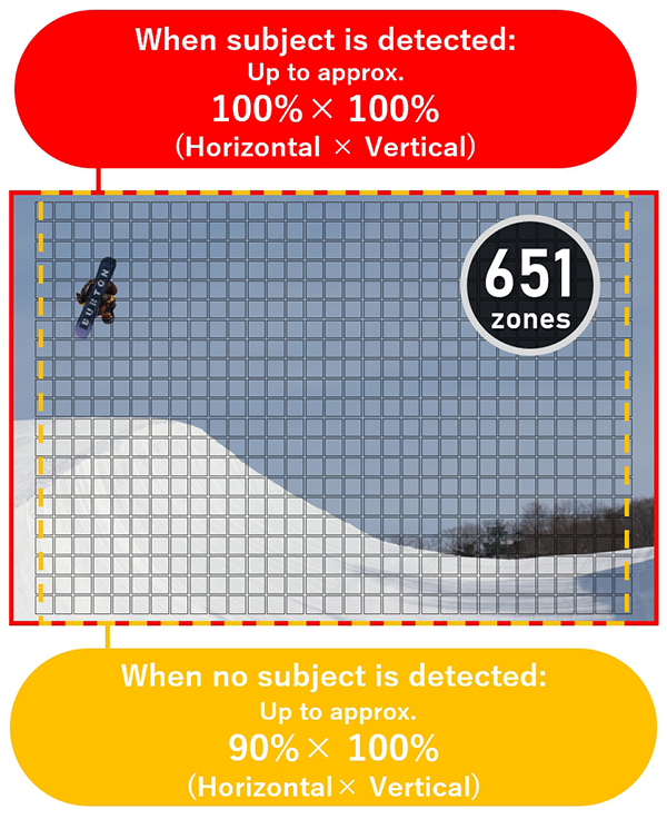 AF can be conducted over up to 100% of the image frame (horizontal x vertical, in Whole Area AF mode when a subject is detected). With AF operating over up to 651 finely divided zones, supported by the advanced subject detection and tracking abilities of EOS iTR AF X, you can expect accurate focusing right up to the edges of the image.