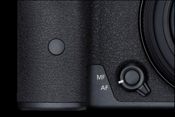 A focus mode switch is located on the camera body on the bottom right below the lens. This switch makes it easy to toggle between AF and MF modes even with a lens that has no AF/MF switch. The button in the middle is the depth-of-field preview button.