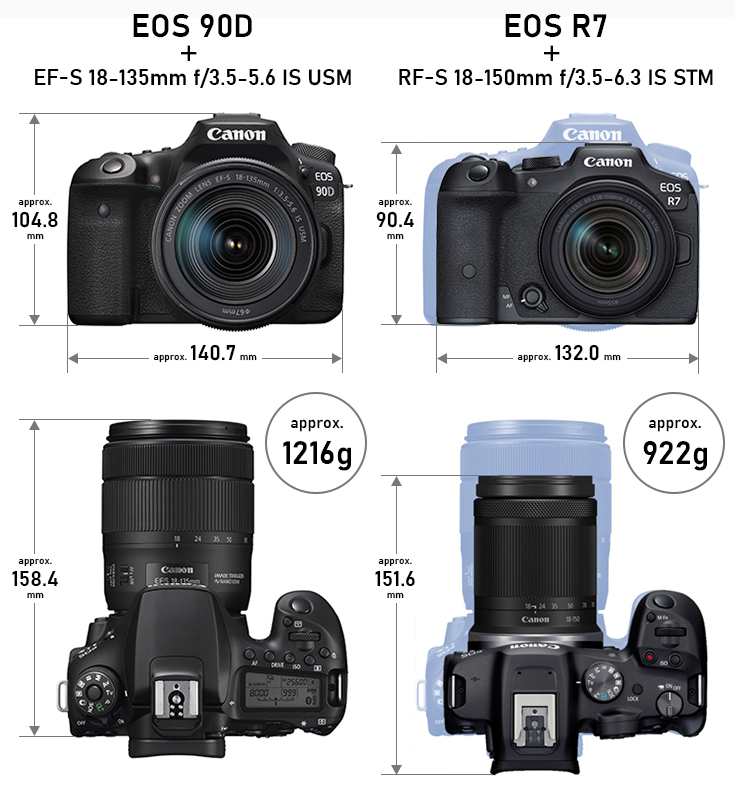 The EOS 90D combined with the EF-S18-135mm f/3.5-5.6 IS USM kit lens weighs around 1216g, whereas the EOS R7 with the RF-S18-150mm f/3.5-6.3 IS STM kit lens weighs only around 922g—around 24% lighter.
