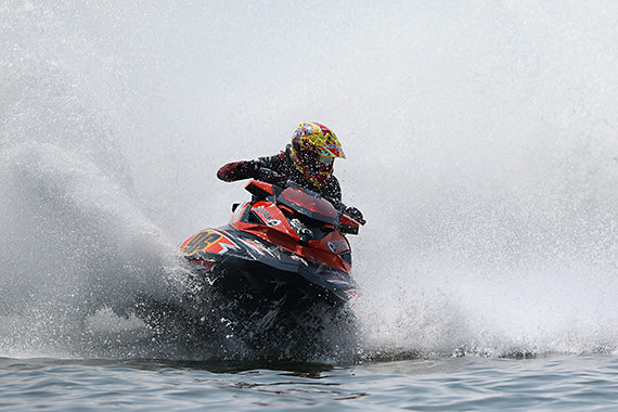 A shot of a jet ski speeding through the water, creating fierce splashes. Singe-point AF continues to maintain the focus on the top skier without any hunting caused by the splashes.
