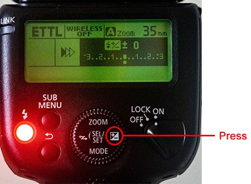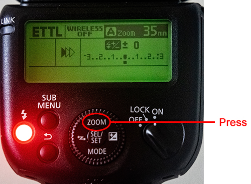 1. Press the [ZOOM] button. (On some Speedlite models, look for the [Zm/C.Fn] button.)