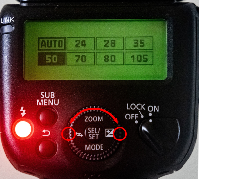 2. Use the dial or the cross keys to select the flash angle, and then press the "SEL/SET" button to confirm the selection. If “AUTO” is selected, the optimal flash coverage for the attached lens will be used, and no focal length will be shown next to “Zoom” on the flash display.