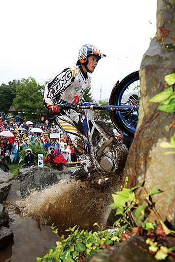 To capture shots of a bike trial, a race that involves vigorous up-and-down movements of the bike and sudden starts, a fast shutter speed is needed. In the example below, I wanted to capture the expression of the rider while emphasising the water splashes, so I made use of high-speed sync and set the shutter speed to 1/800 second. With the flash mode of the Speedlite unit set to E-TTL, I fired the flash with the emitter directed at the subject. The weather was unstable with intermittent sunshine and clouds on the day of the shoot, so I selected Aperture-priority AE to fix the aperture value and exposure control.