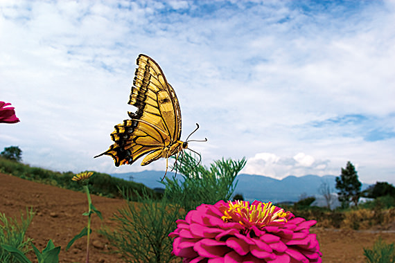 I used a flash to reproduce the vivid yellow of the swallowtail butterfly that was attracted to a zinnia. The butterfly would turn out blurry at a shutter speed that the flash was capable of synchronising with, so I made use of high-speed sync. The exposure mode of the camera was set to Manual, and the shutter speed and aperture value were set to 1/800 second and f/11 respectively. When applying high-speed sync on a moving subject, you are recommended to set the background to a slightly decreased exposure.