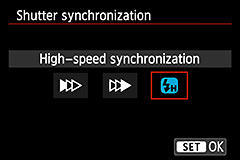 Press the High-speed sync/Shutter curtain synchronisation button. To make use of high-speed sync, simply press this button on the flash unit. For flash units that do not come with this button, select [Flash control] in the camera menu, and change the synchronisation settings for the external flash.