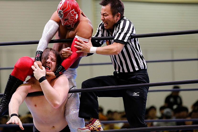 NJPW wrestler BUSHI about to put a camel clutch on David Finlay.