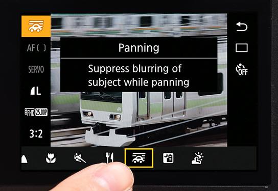 In this mode, the camera automatically sets the shutter speed based on the panning speed and focal length of the lens. You can select from the 3 panning effect levels: “Min.”, “Med.” and “Max.”. This feature allows anyone to enjoy feature-packed panning with ease by simply placing the subject in the frame (the position is adjustable) that appears on the screen, and moving the camera along with the subject.
