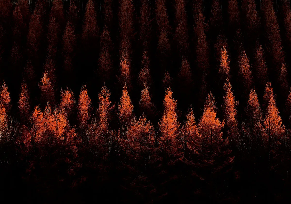 Japanese larch trees are the only species of conifer in Japan that changes colour in autumn, and this shot is of a forest of them lined up rhythmically on a slope.