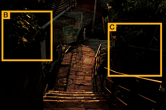 (B) and (C): A brick wall and trees that flanked the staircase. They were cast in shadow, and I incorporated them into the shot so that (A) would stand out better.