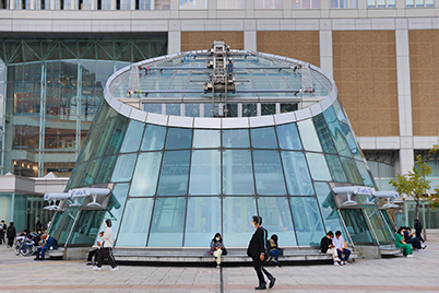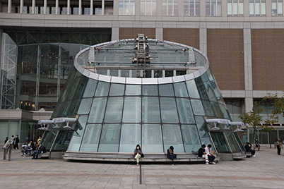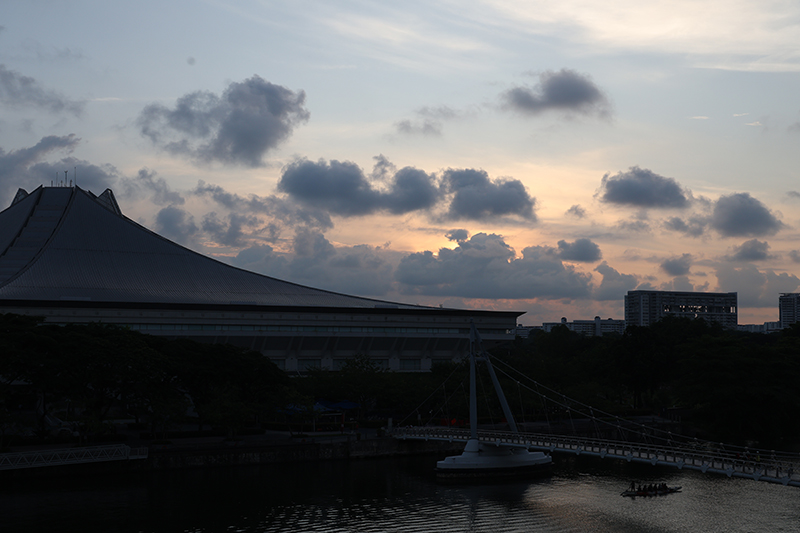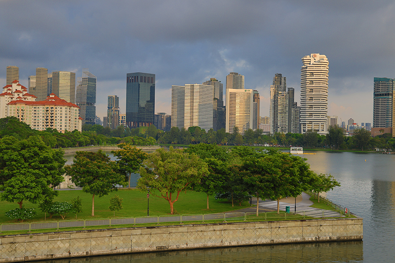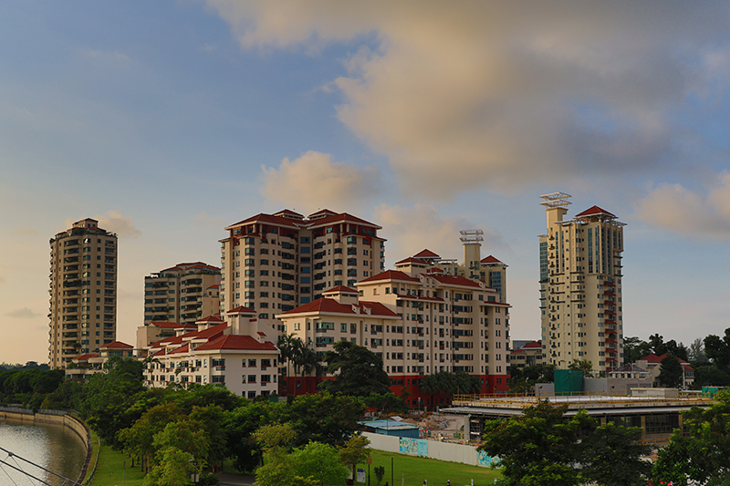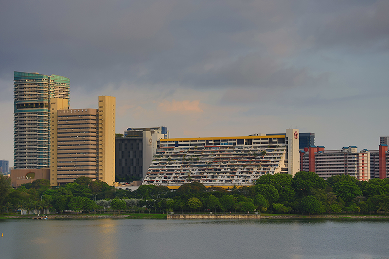 The same scene, shot in a normal shooting mode with no HDR. As it was an overcast day, the colours look dull. On the left side of the image, the lack of light has led to deeper shadows under the building's overhang structure, making details less visible.