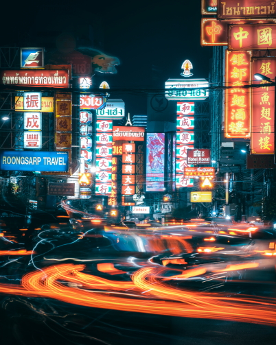 Yaowarat glowing with colourful neon lights at night. Telephoto lenses were essential for capturing distortion-free close-ups of the signs in these two pictures.