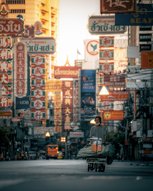 A man pushes a cart of goods down Yaowarat Road early in the morning. The signs in the background make a very interesting backdrop for photos of people. To make the subject stand out better in this unposed street image, I shot with a telephoto lens, which inherently has a shallower depth of field. The telephoto compression also makes the signs look bigger.