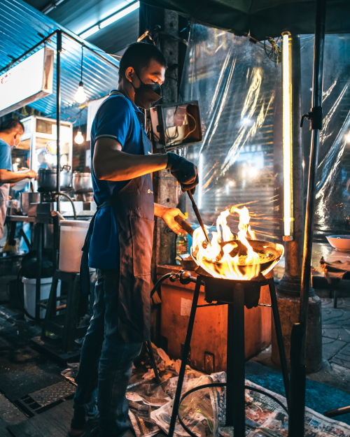 A street vendor fries noodles in a flaming pan. Watching and photographing the vendors preparing food can be just as fascinating as the food itself! A wide-angle lens (in this case, the RF24mm f/1.8 Macro IS STM) allowed me to comfortably frame in the sights of the bustling night market despite the crowds and narrow walkways.
