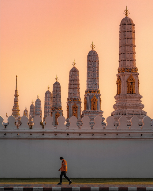 A man walks past the eight towers, or prang, of Wat Phra Kaew (Temple of the Emerald Buddha), which are in perfect alignment behind the walls. His orange jacket accentuates the golden details on the towers. Closely associated with Thailand’s kings, Wat Phra Kaew is considered the most sacred Buddhist temple in Thailand.
