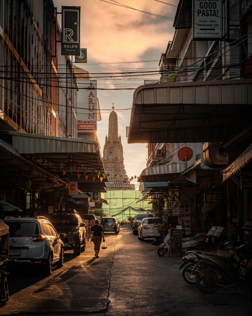 Backlit by the evening light, a woman walks through an alley towards Wat Arun (Temple of Dawn). The glittering gold and elaborate details in the style of the Rattanakosin era make the temples and buildings in this area very distinctive, even from a distance. Bring a zoom lens or a telephoto lens to access these details better!