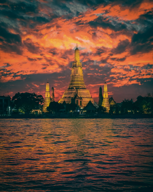 Wat Arun glows against the fiery sky at sunset, reflected in the Chao Phraya River. Have you ever had that feeling of being in the right place at the right time? That’s what it feels like when you visit the Phra Nakhon district in the early morning, or the late afternoon until the sunset. The angled sunlight reflecting off the golden roofs of the temples makes a magnificent sight! It may be hot, but you’ll have an amazing time wandering around the area, enjoying the scenery.