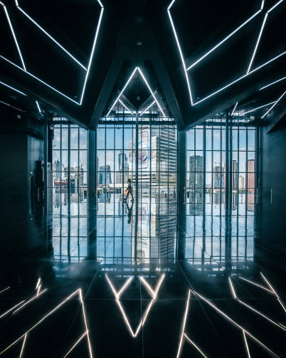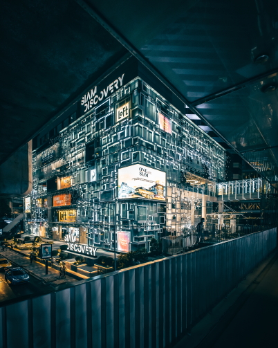 Siam Discovery shopping mall and the distinctive lights on its façade. At the top of the image, the sky train rails (left) and roof of a bridge (right) create an interesting frame together. From this angle, their intersection coincides with the corner of the building, emphasising the lines and geometry in this image.