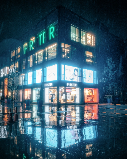 Rainy vibes at night. The rain, neon lights, and reflections combine to create a beautiful, surreal atmosphere.