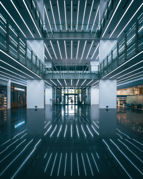 An open passage that connects Siam Square and SiamScape. Here, tilting the camera upward further enhances the 15mm ultra-wide-angle perspective, making the ceiling look impossibly high.