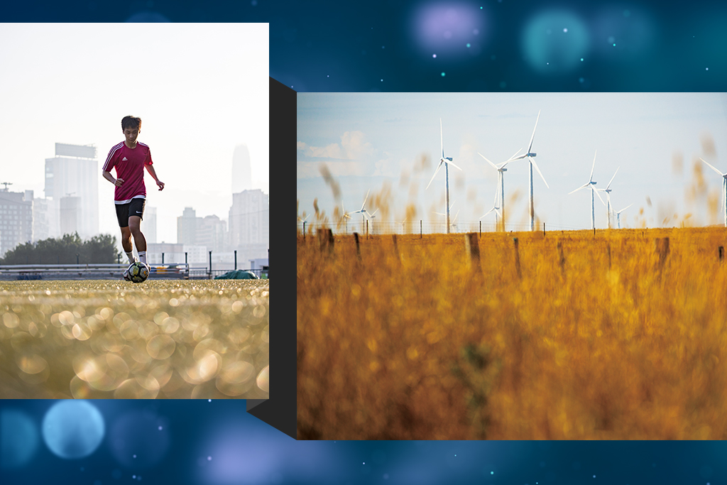 Grass itself can be a fascinating foreground element. If the light conditions are right, you can transform a normal grass field into a sea of sparkles, which, in this shot, perfectly symbolises the youthful hope and energy of the young soccer player in this sports portrait.