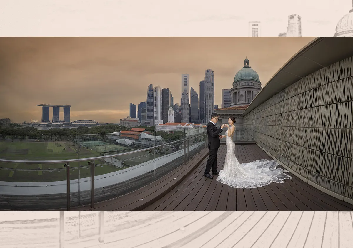 I started doing wide-angle panorama shots after I began to do destination pre-wedding shoots. We went to many scenic locations, but even with an ultra-wide-angle lens, it was often hard to capture the entire scene in a single frame with satisfactory results. Even if we did get the entire scene in, the couple would look too small and be “overpowered” by their surroundings.
