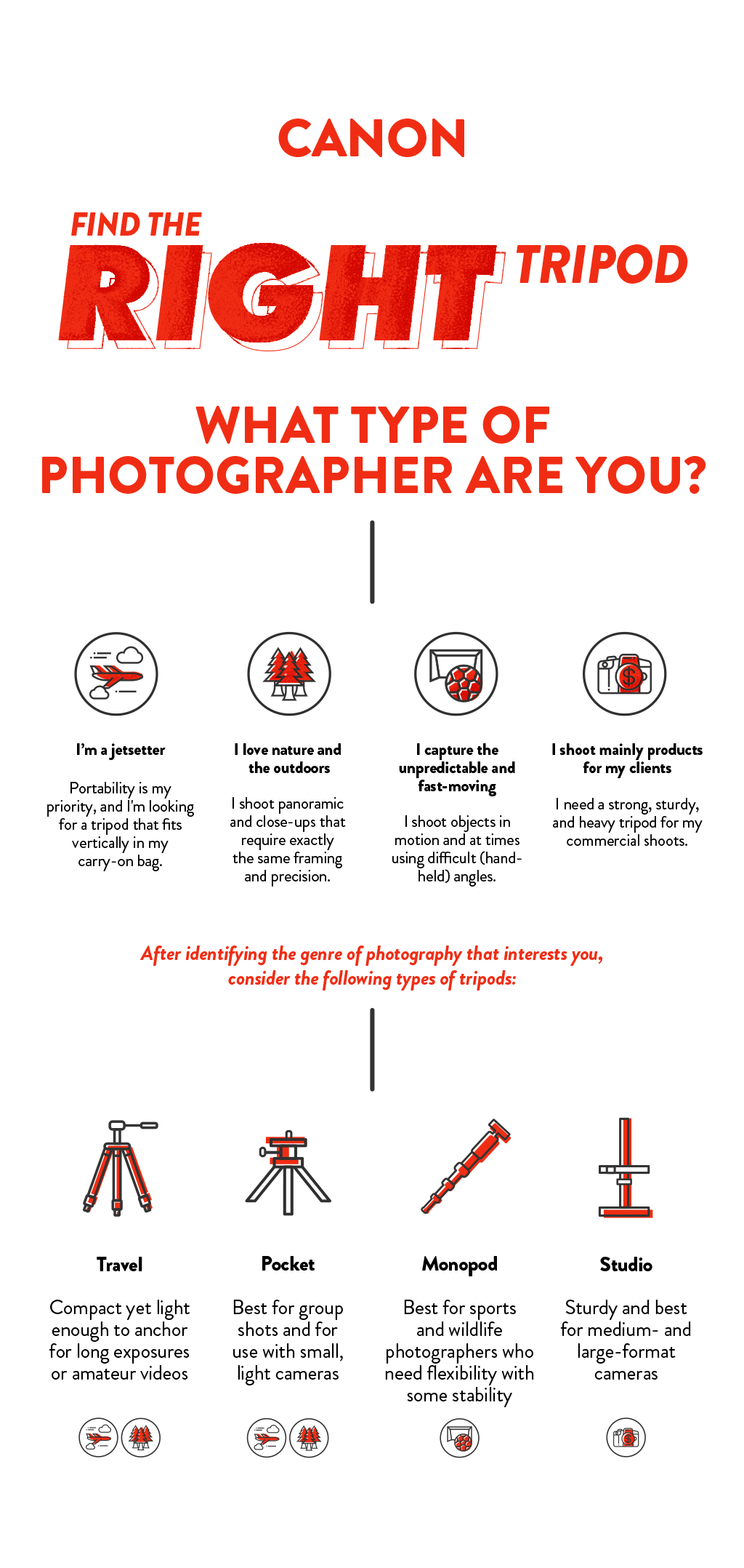 Choosing the right tripod can be an overwhelming experience, with the many different types and choices available in the market. For this infographic, we’ll help you make the decision based on the type of photography that interests you.