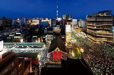The Sanja Festival, which is held at Asakusa in Tokyo, is one of the most famous festivals in Japan. On the night of the event, light rays on the ground co-appear in perfect harmony with the dim light of the sky at dusk when the second portable shrine passes by the area near the Kaminarimon (Thunder Gate) to enter the shrine grounds. Both the audience and the shrine bearers come together as one, creating an air of excitement that brings the event to a climax.