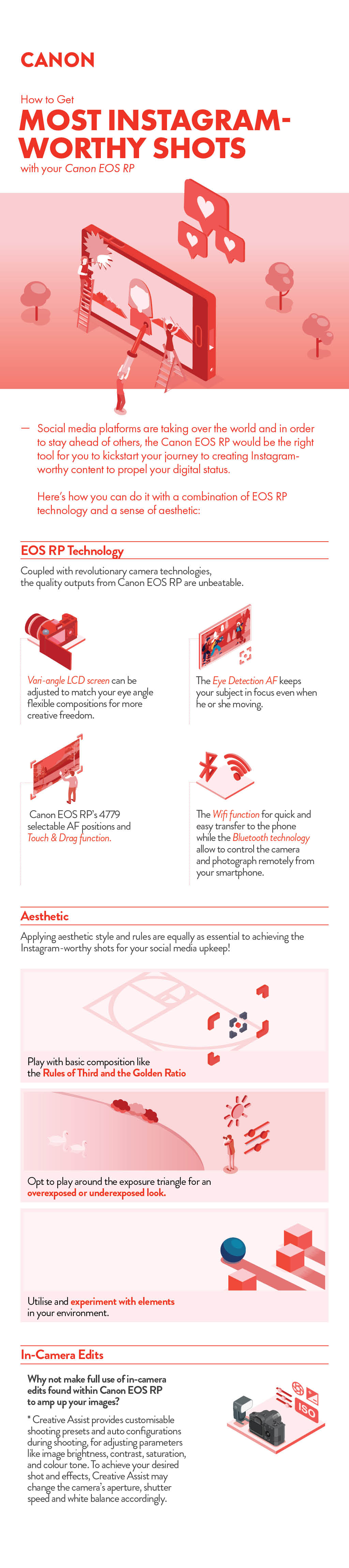 If you’re aiming to achieve an #InstagramWorthy feed and be the best Instagrammer among your peers, an entry-level full-frame camera like Canon EOS RP can be great in helping you get there. From using the camera’s tech to adapting aesthetic styles, check out the infographic below on why Canon EOS RP is your go-to camera and how to utilise it to capture the best Instagram-worthy shot for your social media upkeep.