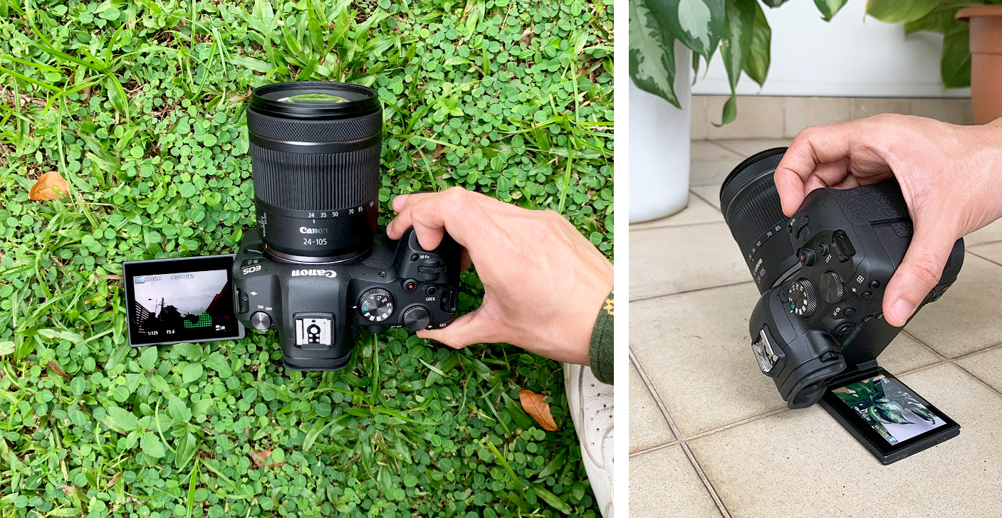When it comes to a low-angle perspective shot, one will usually have to position the camera to the ground. For cameras without the Vari-angle LCD screen, it can be difficult to view the scene you’re shooting through the display screen or viewfinder. However, with the Vari-angle LCD screen, all you need to do is flip it out and turn it so it’s parallel to the ground (check out the positioning below!). This way, you can view the screen easier just by looking down at the camera. On the right image below, we're showing you how you can shoot vertically with a low-angle perspective by flipping the screen out to face you. This is only achievable using a camera with a flip-out screen. You can tilt it towards you for vertical orientation as compared to other cameras that have a tilt-up only screen suited only for horizontal shots.
